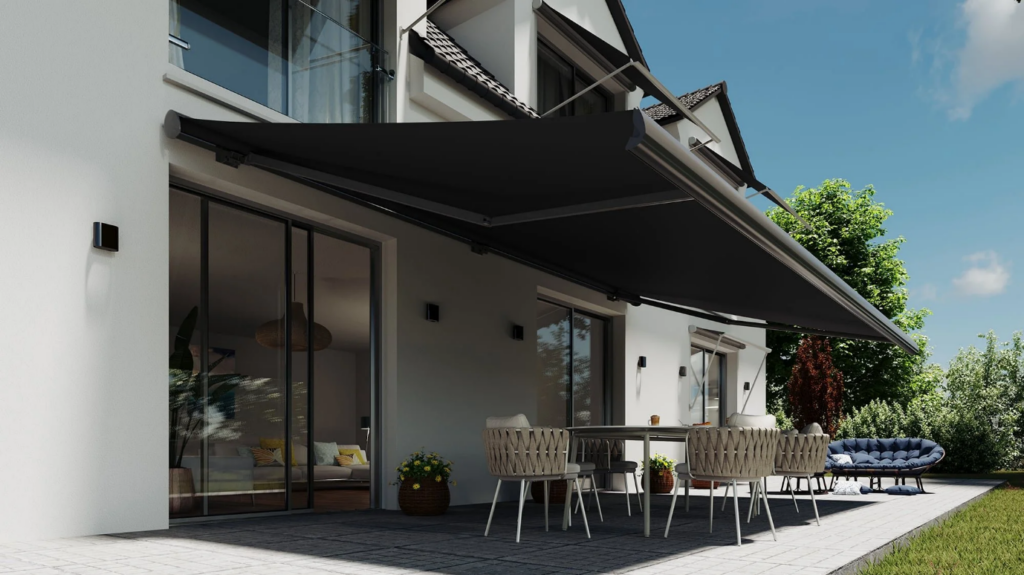- Beutre / Chemin Long : Pour les villas contemporaines avec grandes terrasses, nous installons des stores « XXL » pouvant aller jusqu’à 6 mètres de large avec une avancée de 4 mètres, motorisés pour un confort absolu.